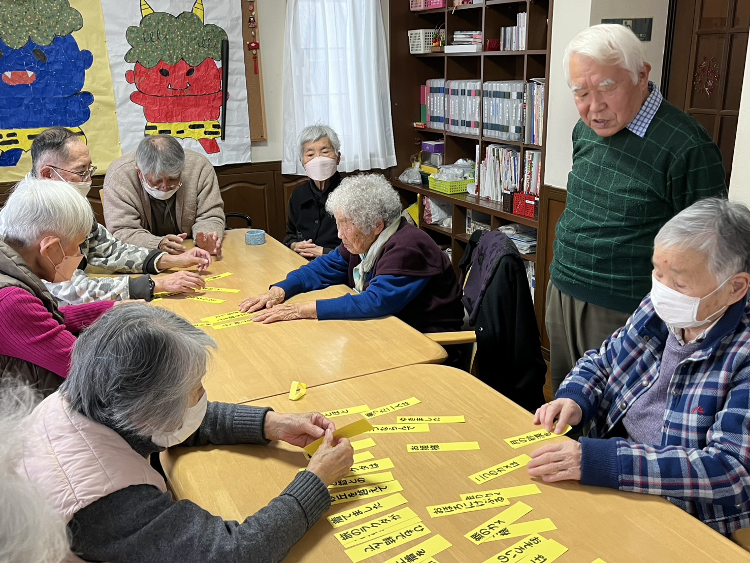| R8年2月7日村杉リーダーの脳活いきいきプログラム 『昭和歌謡歌詞カード合わせゲーム』を 懐かしい歌を口ずさみながら楽しむ様子。 |