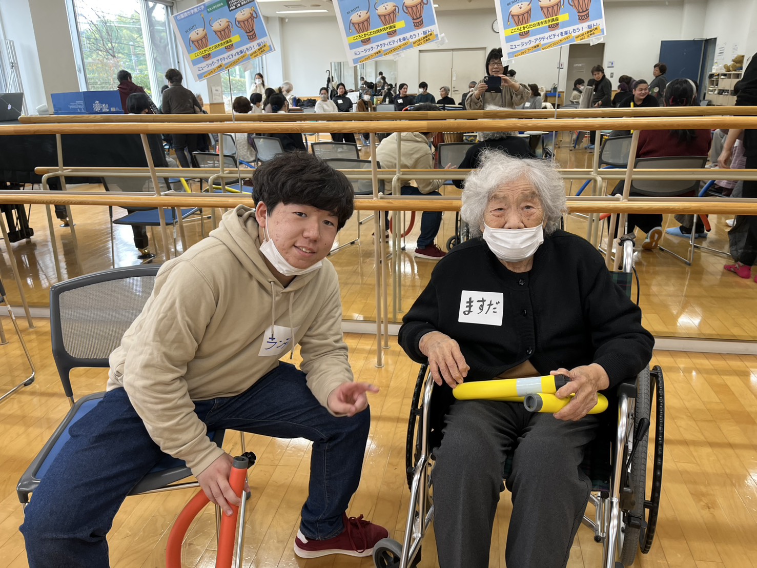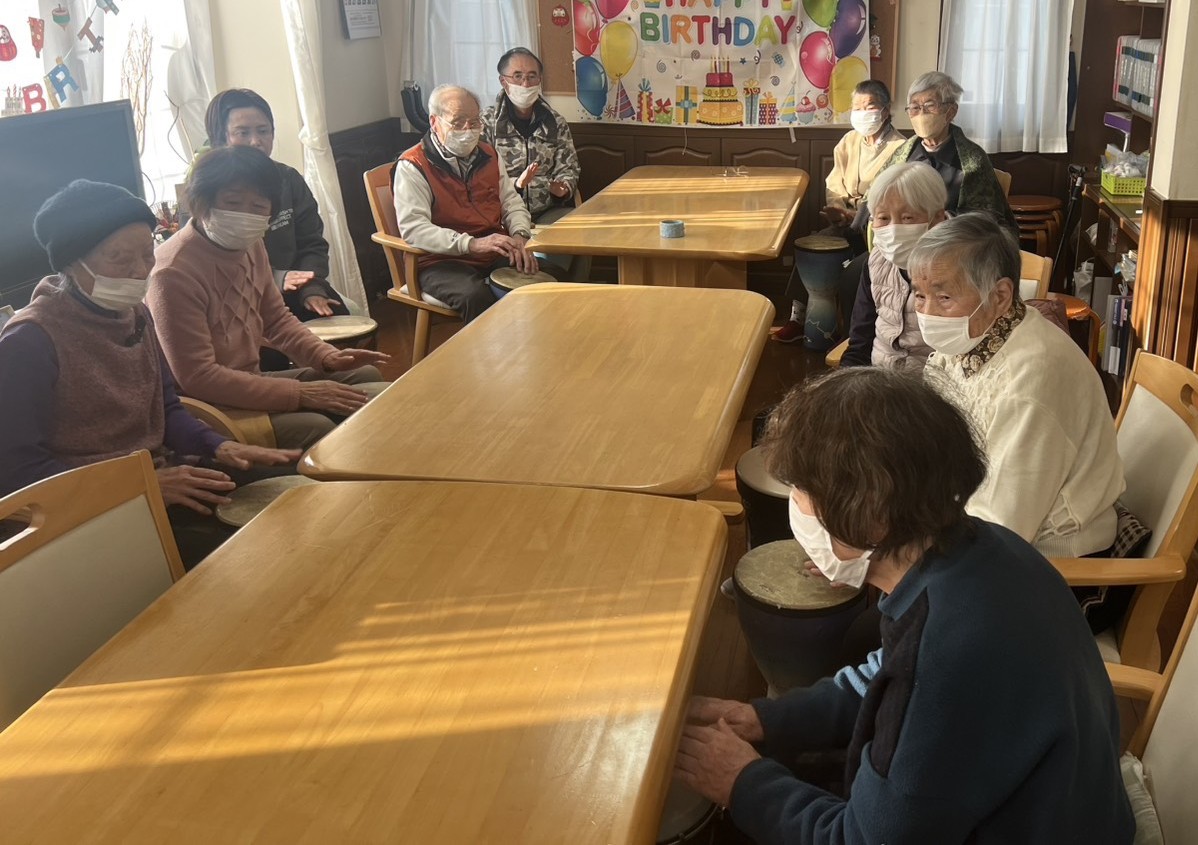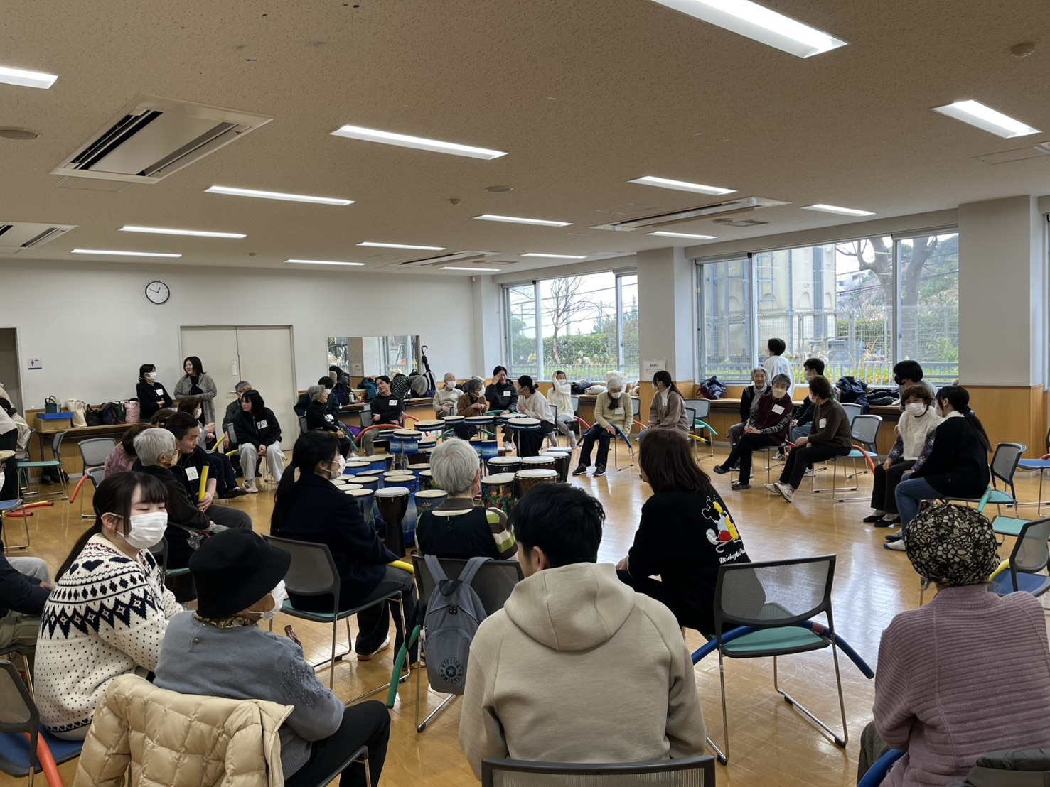 | R7.12.20.田園調布学園大学の学生さん達と 交流会『こころとからだの活き活き講座』に参加 若い学生さん達と一緒にジャンベを打ち鳴らしたり ミュージックフープで身体を動かしたり ルーチェから参加の皆さんの心も身体も元気一杯でしたよッ! |